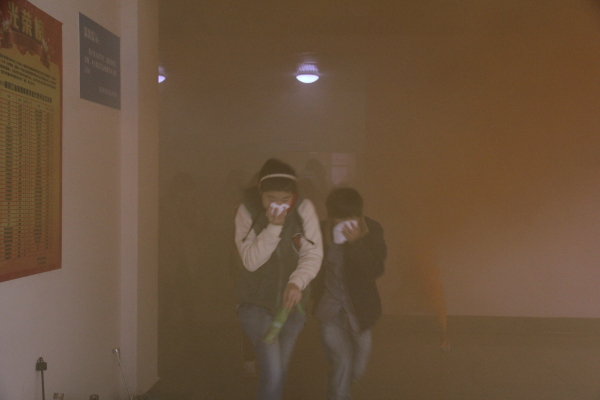 12点20分,随着演练总指挥李玉兰经理一声令下,三号教学楼“突发火灾”,浓烟翻滚,第一个发现“火灾”的教师以哨声预警,随即各位员工干部在楼道内大声广播、提醒,第一时间向“119”和公司报警电话“88223110”报警,并组织引导各班级同学有序逃离“火灾”现场。听到哨声报警之后,各位师生在团学干部的引导下开始井然有序的撤离,大家快速而熟练地拿起毛巾,沾湿,捂住口鼻弯腰前进,从报警到疏散到校田径场共用时十分钟。