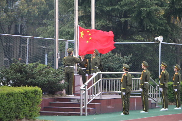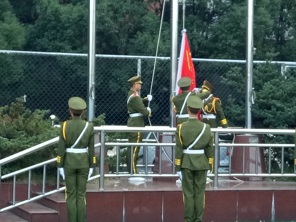 升旗仪式于6:50准时开始,英姿飒爽的旗手们迎着朝阳,以饱满的精神,庄严地护卫五星红旗。伴随着嘹亮的国歌声,鲜艳的五星红旗冉冉升起,全体师生集体行注目礼,强烈的爱国热情在全体师生心中点燃。