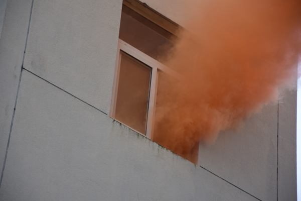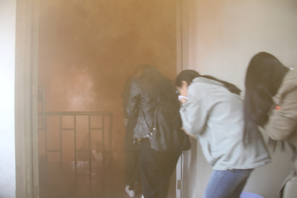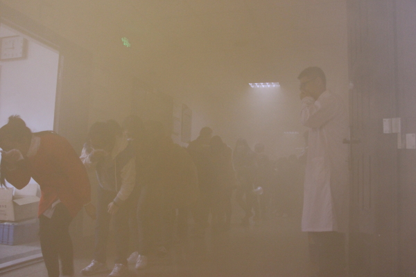 12点20分,随着演练总指挥何军邀经理一声令下,一号实验楼“突发火灾”,浓烟翻滚,第一个发现“火灾”的田宗明教师指导员工第一时间向“119”和公司报警电话“88223110”报警,随即各员工干部在楼道内大声广播、提醒,并组织引导各班级同学有序逃离“火灾”现场。各位师生在实验员和团学干部的引导下井然有序的撤离,大家快速而熟练地拿起毛巾,沾湿,捂住口鼻弯腰前进,从报警到疏散到集合地点共用时7分28秒。
