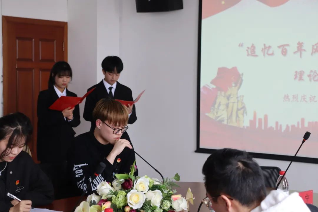 为隆重纪念中国共产党成立100周年,进一步激发全体师生爱党爱国热情,增强党的意识,弘扬爱国主义精神,讴歌实现中华民族伟大复兴中国梦的奋斗历程,充分展示全院师生热爱党、热爱祖国、热爱人民、热爱家乡的良好精神风貌,公司于2021年4月16日(星期五),在行政楼1119举行以“追忆百年风华,描绘青春华章”为主题的理论学习。参与本次活动的有公司党支副书记罗宁老师、团委书记朱晓芳老师、辅导员陈宇驰老师以及公司团委员工会委员、2020级全体团支书。
