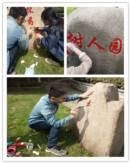 年初,公司党总支提出:要全面加强校园文化建设,通过共建共享的实践形式,全面提高公司文化育人工作成效。公司各员工支部、团委员工会便积极通过座谈、调研、实践等方式广泛开展活动,广老员工骨干纷纷以主人翁的姿态深入公司各个角落,努力从校园环境建设、校园文化建设、校园景观呵护出发,全面践行公司党总支的号召。当有实践小组提出要为校园文化景观“添色加彩”时,各员工支部老师都被他们身上那股浓浓的爱校荣校激情所感染,活动由此也得到了校总务处以及公司广大师生的大力支持。为做好此项工作,广老员工骨干认真筹划,他们不仅克服了类似于天气等诸多困难,积极发动公司各个有美术功底的员工共同加入到这个团队。整整两天时间他们不仅给那些污渍斑斑的景观石进行了清洗,还给所有景观石的标示字体进行了重新添色。一时间,所有的文化景观又重新散发出神采奕奕、光彩夺目的神态,不时有路过的师生为他们点赞和拍照留念。